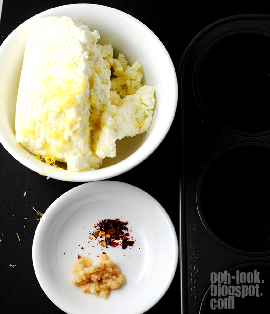 Simple ingredients for the baked ricotta - low-fat ricotta, lemon rind, chilli flakes and garlic. And a muffin tin with at least 4 holes.